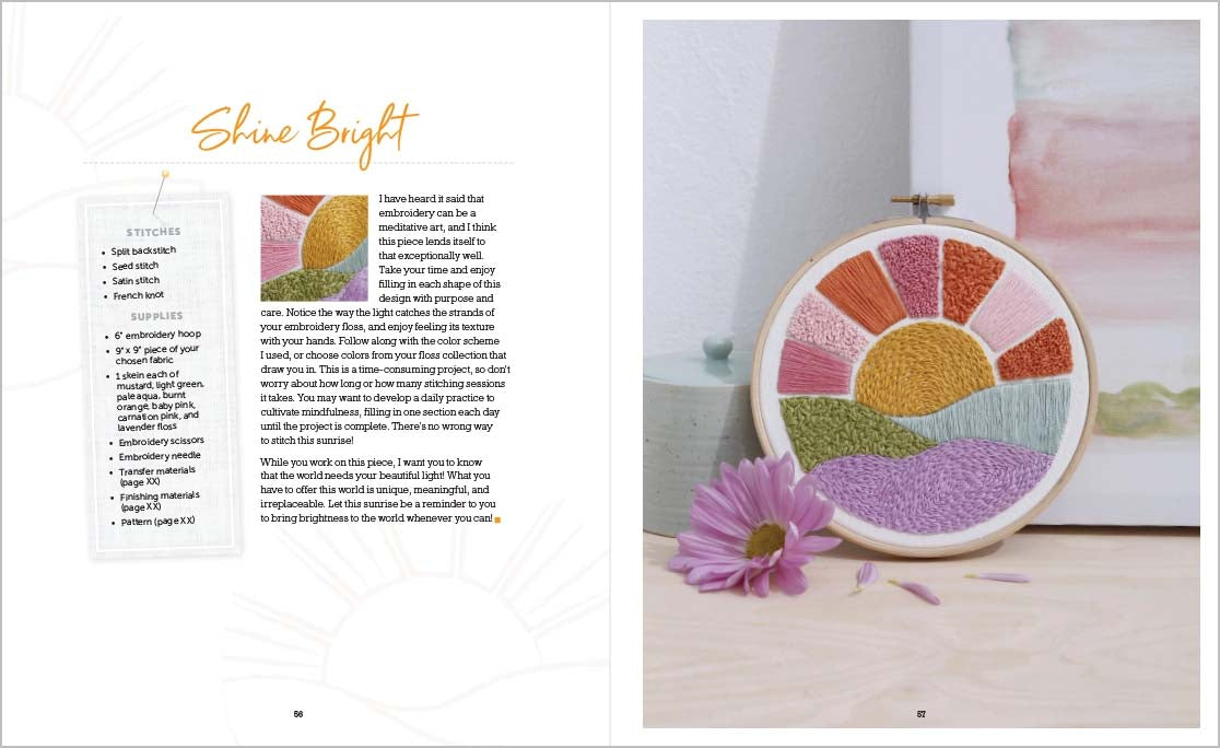 • 16 cheerful embroidery projects that build your skills as you work through them • A sunny sampler project to help you practice each stitch • Easy-to-follow stitch diagrams • Inspiring quotes and creative prompts to enhance the relaxing benefits of stitching • Expertly designed full-sized patterns for each project