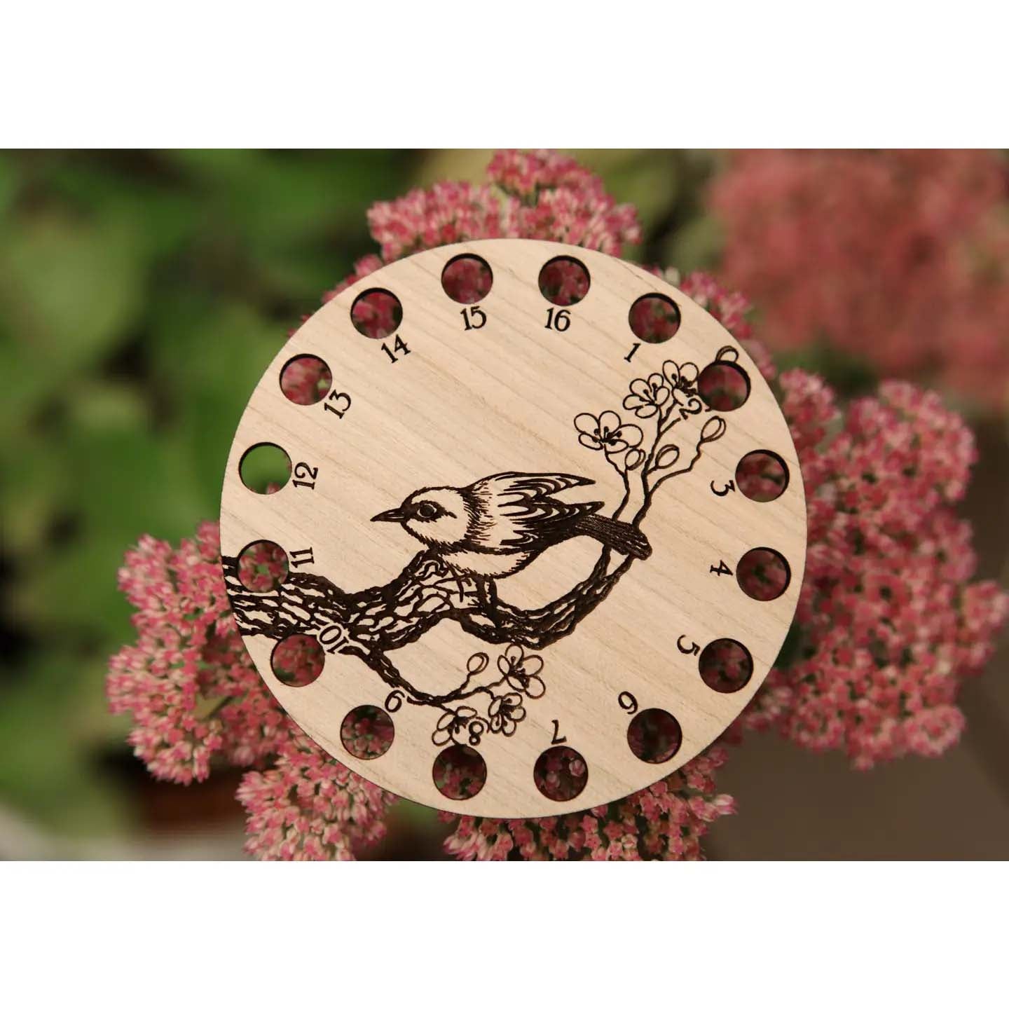 Embroidery floss organizer made from cherry wood. This cute bird on a branch of a cherry blossom tree needlepoint thread holder has 16 circle holes to keep your yarn organized.
