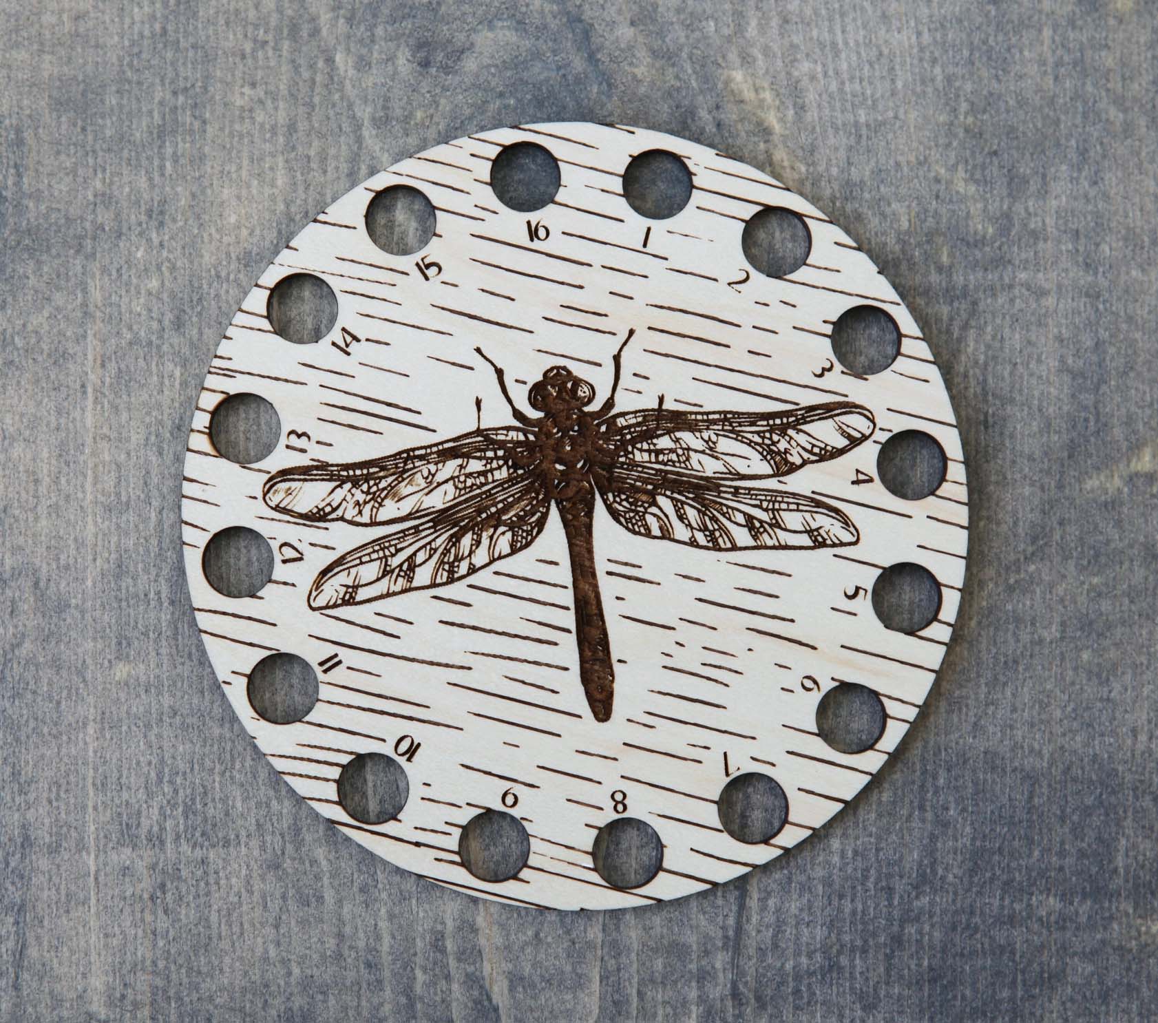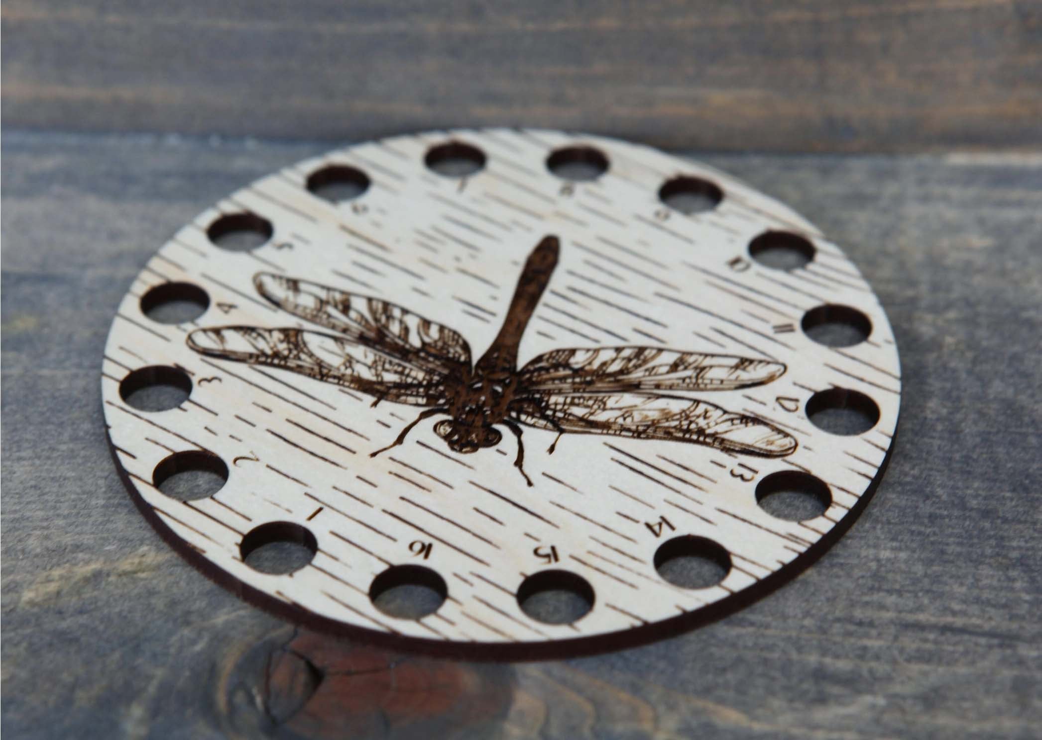 Embroidery floss organizer made from maple wood. This flying dragonfly insect needlepoint thread holder has 16 circle holes to keep your yarn organized.