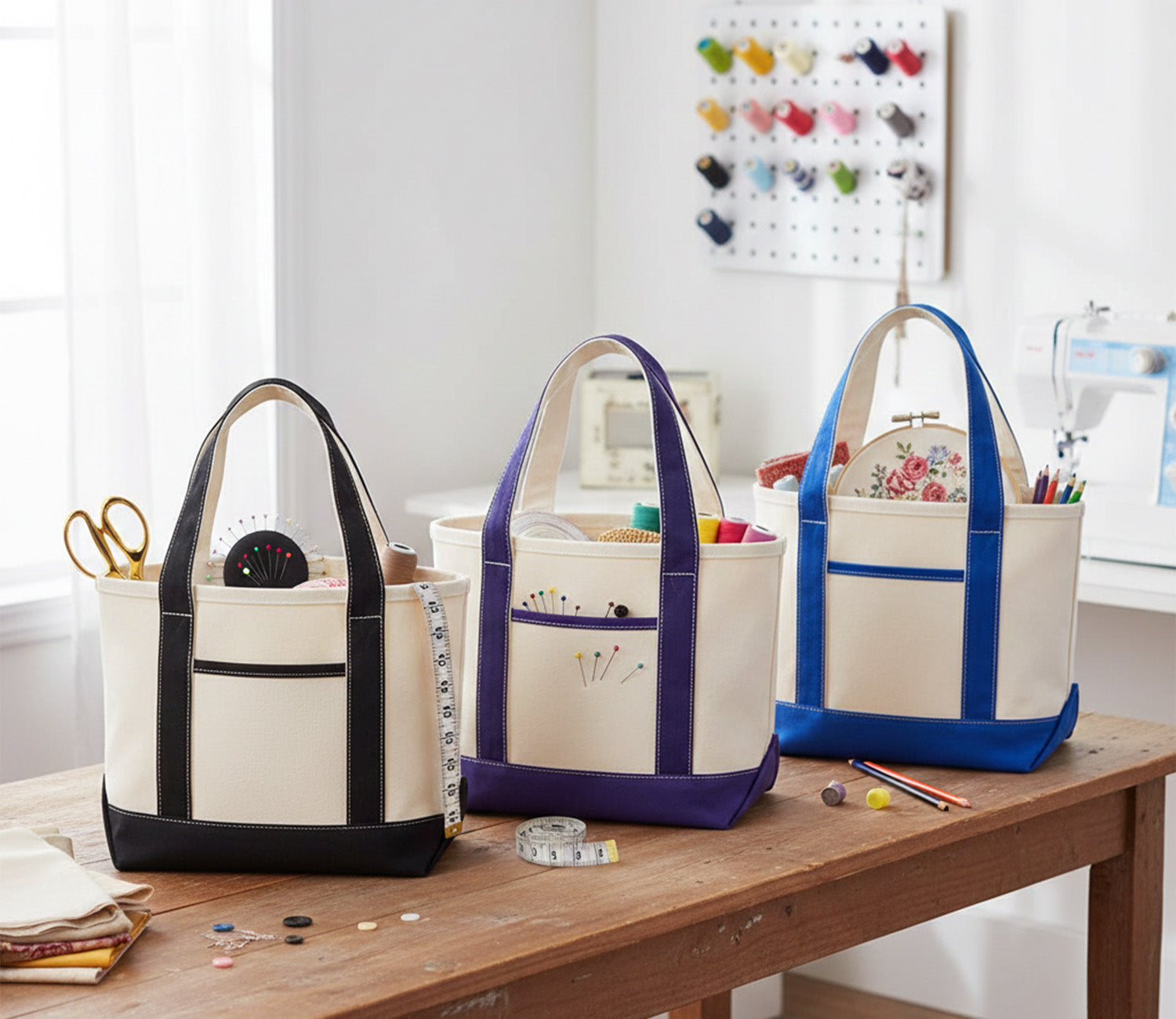 Heavy-Duty Canvas: Crafted from premium, thick cotton canvas with a reinforced bottom. It stands upright on its own, making it easy to reach in for your scissors or thread without th bag collapsing.