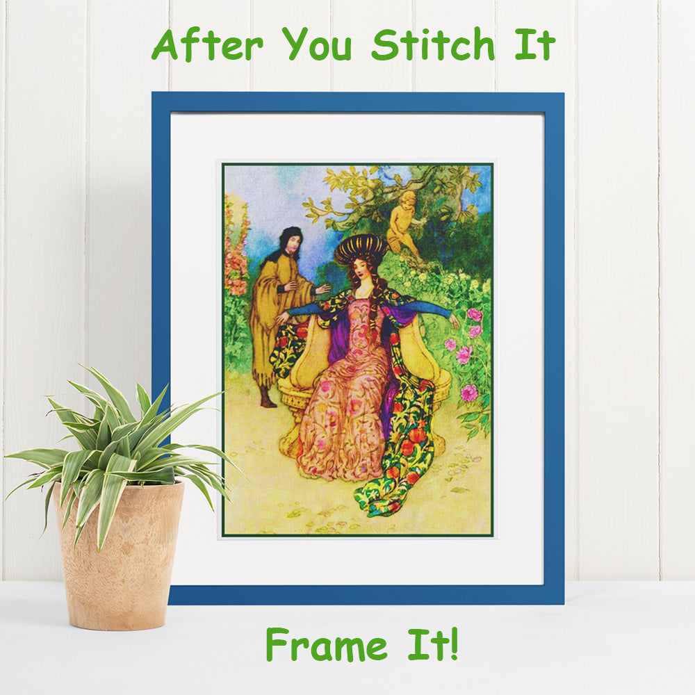 Stitch a story that'll last for generations with Warwick Goble's "Mermaid Combing Her Hair" counted cross stitch chart pattern. Brightly colored and intricately detailed, it's a magical way to capture the beauty of the sea. Create a keepsake masterpiece today!